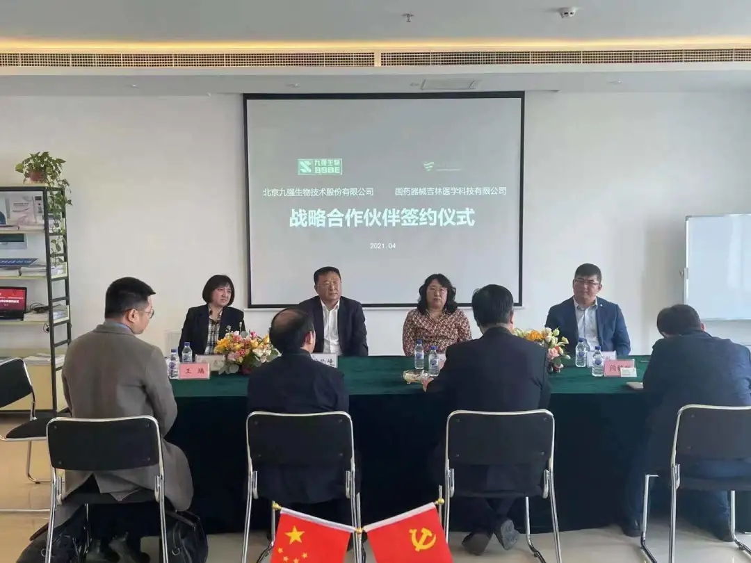 2021年4月21日,开云online(中国)与国药器械吉林医学科技有限公司就九强在吉林省四平市国药端销售事宜签订了战略合作协议,协议中明确了合作原则和目的,确定了销售方式及供货价格等。参会人员有:国药器械吉林医学科技有限公司副董事长徐险峰、总经理徐春梅、常务副总经理韩立彬、商务经理鲍鑫,开云online(中国)董事长邹左军、副总周明、东北大区总监闫铭锐、吉林省区总监王禹。