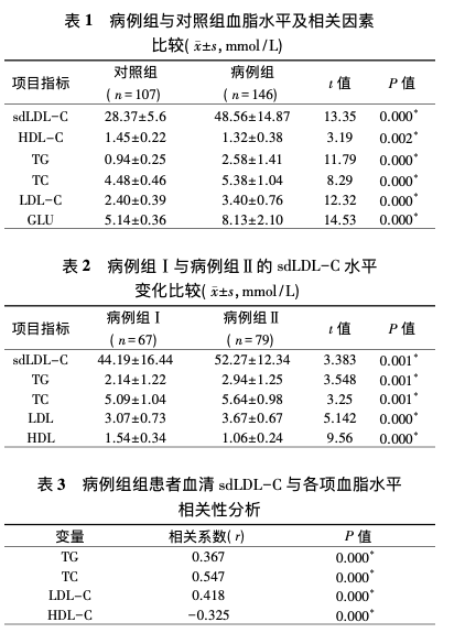 齐齐哈尔医学院附属第三医院的杨秀静等[6],将146例T2DM患(其中男85例,女61例;年龄30~70岁)中单纯T2DM患者67例为病例组Ⅰ,T2DM及并发症患者79例为病例组Ⅱ;另选择同期健康体检者107名作为对照组。两组均进行sd LDL-C、GLU、TC、TG、LDL-C、HDL-C检测。观察T2DM及其并发症患者血清中sdLDL-C水平变化情况并分析其临床应用价值。研究结果表明,sd LDL-C在T2DM患者中升高明显,sd LDL-C与TG、TC、LDL-C呈正相关与HDL-C呈负相关。观察sd LDL-C的变化情况可用于预测T2DM并发症病变发生风险。