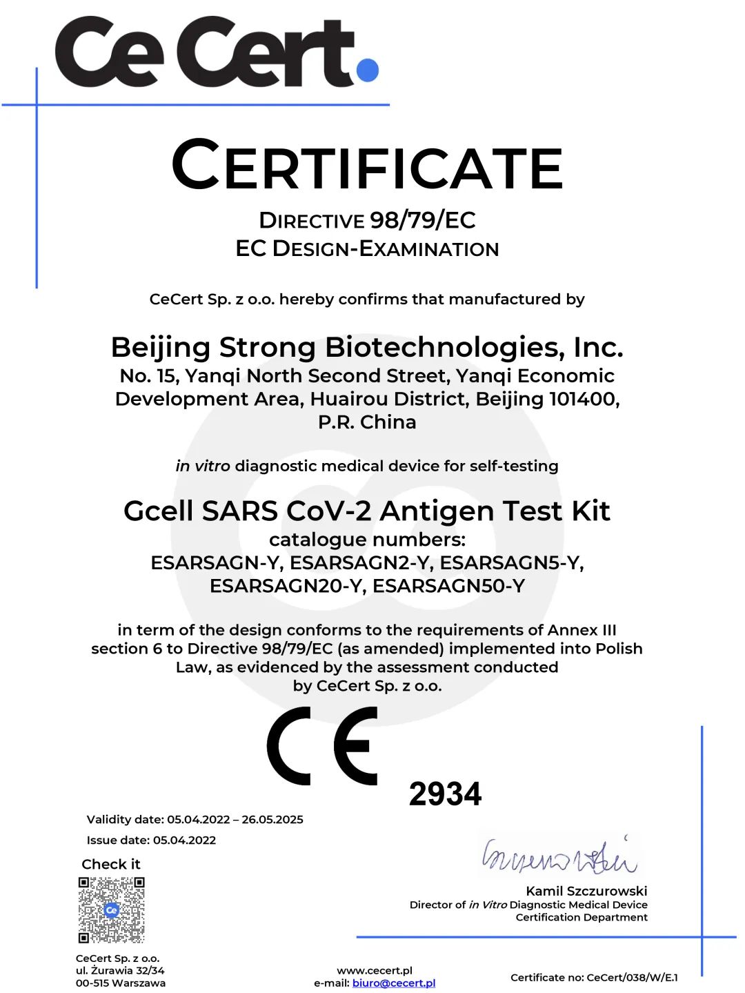 开云online(中国)新型冠状病毒抗原自测试剂盒(SARS CoV-2 Antigen Test Kit)于2022年4月5日取得欧盟CE准入资格!这意味着该自测试剂盒可在欧盟国家以及认可欧盟CE认证的国家进行销售。