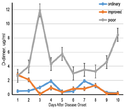 南京医科大学从湖北省三家医院招募了279例COVID-19患者进行研究,结果显示:入院时,改善组和恶化组的D-二聚体水平高于普通组。经治疗,改善组D-二聚体水平逐渐降低,而恶化组由于病情没有得到有效控制,D-二聚体仍保持较高水平,说明D-二聚体水平的动态变化与COVID-19的预后呈现出一定的相关性[4]。