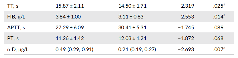 血浆D-二聚体是交联纤维蛋白在纤溶酶的作用下水解产生的特异性降解产物,主要反映纤维蛋白的溶解功能,是确定体内有无血栓形成及继发性纤溶的特异性指标之一,也是反映凝血与纤维蛋白溶解活化的分子标志物[2]。