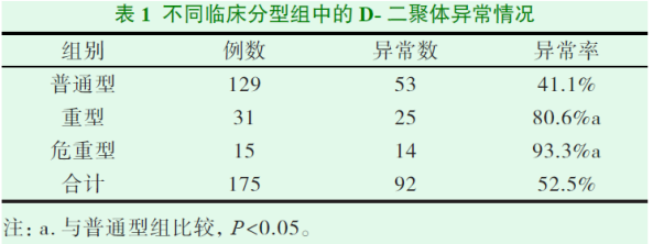 对武汉雷神山医院收治的175例成人新型冠状病毒肺炎患者进行研究,以D-二聚体值>0.55mg/L 为异常,结果表明:重型、危重型患者D-二聚体异常率显著高于普通型组,且危重型患者D-二聚体水平明显高于重型和普通型,提示可将D-二聚体作为评价成人COVID-19的严重性指标[6]。