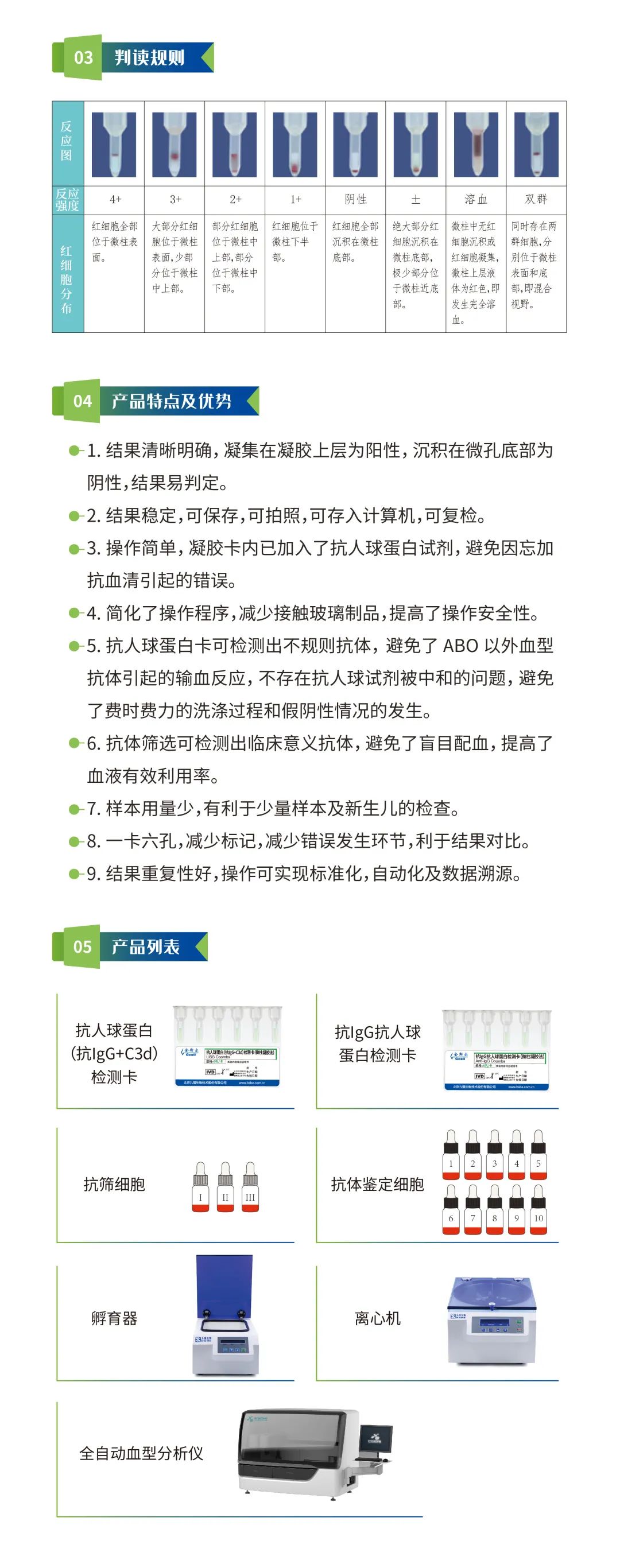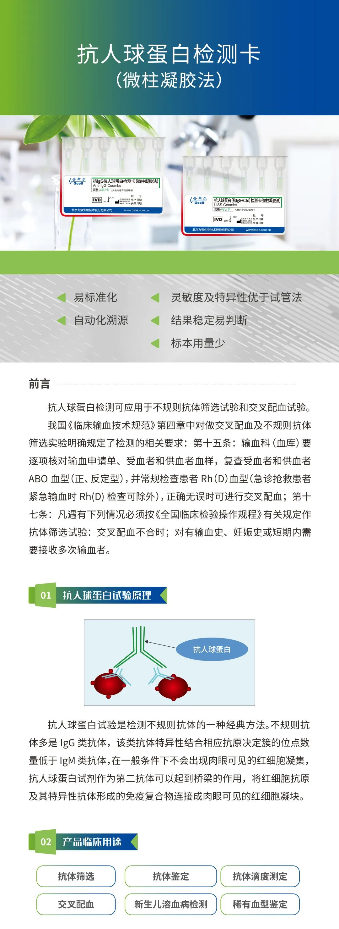 本产品用于间接抗人球蛋白试验,用于交叉配血,仅用于临床检验,不用于血源筛查。