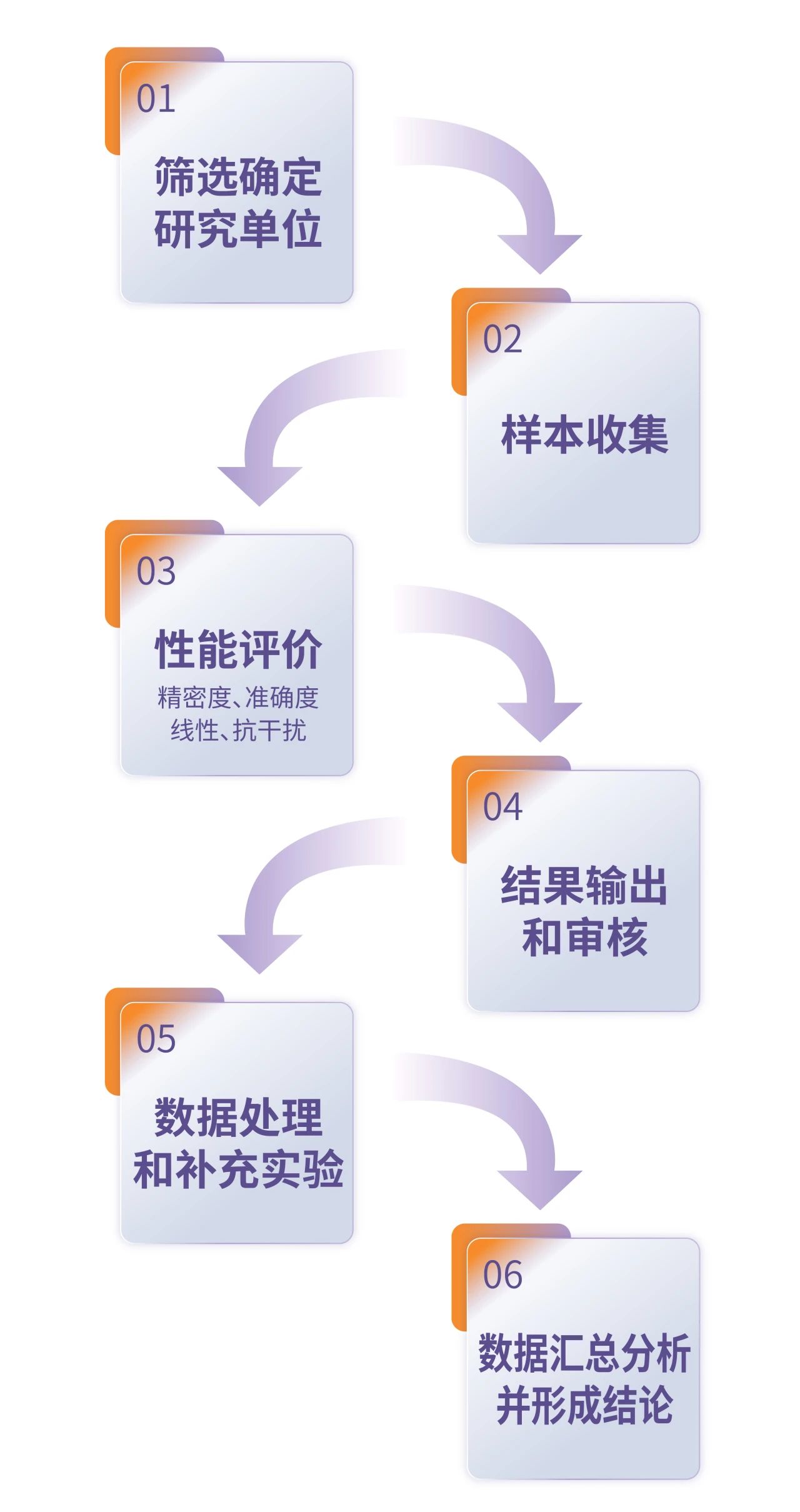 多中心性能验证,要求至少3家单位在规定时间内、依据同一实验方案并使用相同批号试剂对项目性能进行评估,最终汇总各单位检测结果进行比对及综合评估。