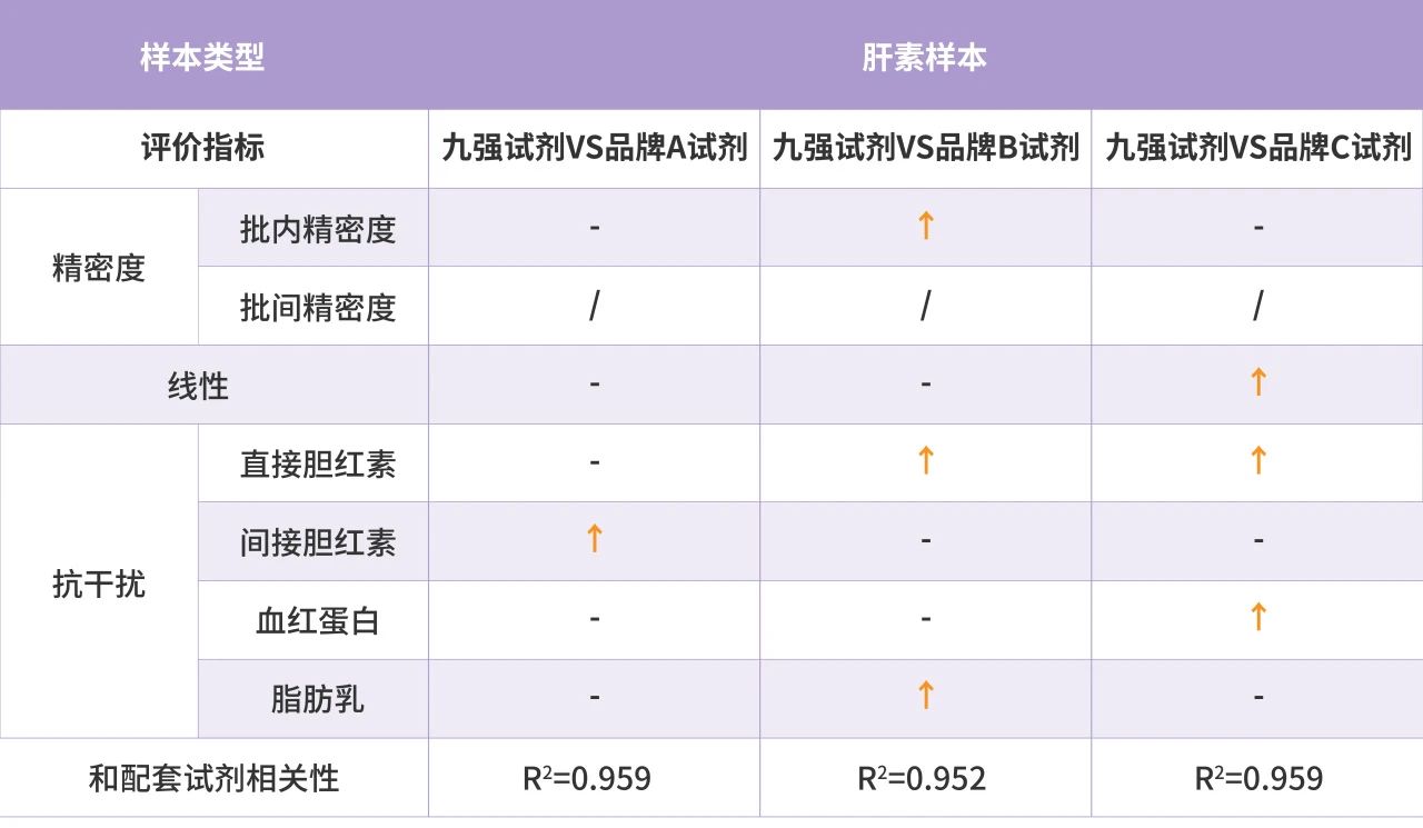 九强直接胆红素可以做到10mg/dl,血红蛋白可以做到125mg/dl,而对照试剂分别只能做到5mg/dl和不到125mg/dl,在直接胆红素和血红蛋白的抗干扰方面均优于原装配套试剂。