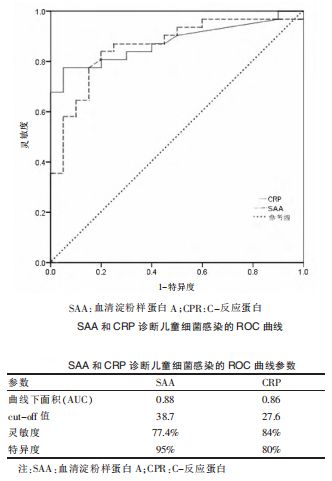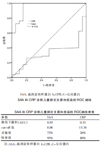 李攀等[3]探讨血清淀粉样蛋白A(SAA)和C-反应蛋白(CPR)检测对儿童支原体肺炎的诊断价值。包括支原体感染患儿124例(支原体感染组)、细菌感染患儿35例(细菌感染组),同期健康体检儿童20例(对照组),分别测定和分析三组SAA和CRP水平,并应用ROC曲线进行分析。结果表明:SAA检测对诊断儿童肺炎支原体感染和细菌感染的准确性均较高;CRP检测对诊断儿童细菌感染准确性较高,但对于鉴别诊断儿童肺炎支原体的意义较小。SAA 检测可用于儿童肺炎支原体感染的鉴别诊断,应在临床中广泛应用。