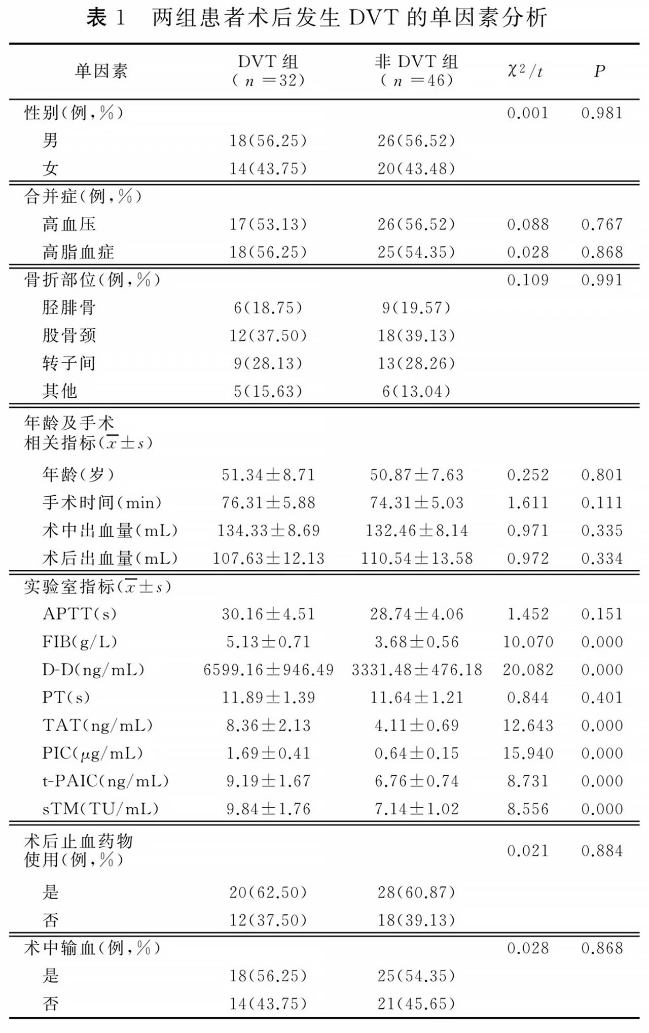 两组患者性别、年龄、合并症、骨折部位、手术时间、术中出血量、术后出血量、APTT、PT、术后止血药物使用、术中输血比较,差异无统计学意义(P>0.05),DVT组FIB、D-D、TAT 、PIC、t-PAIC、sTM 显著高于非 DVT组,差异有统计学意义(P<0.05),见表1。