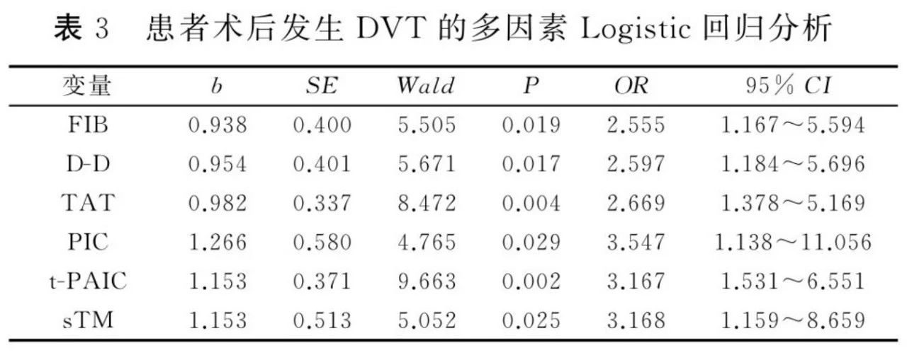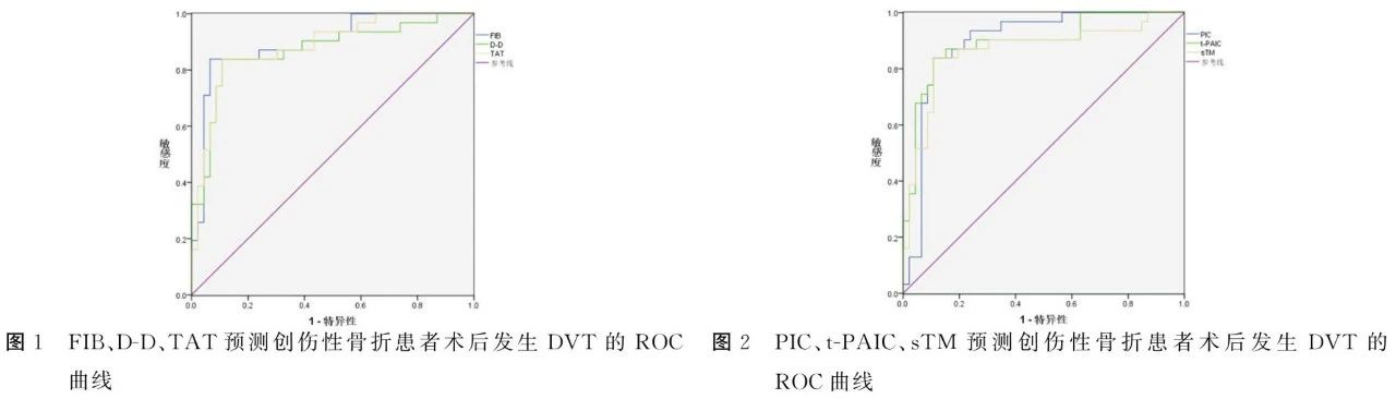 本次研究显示,DVT组FIB、D-D、TAT、PIC、t-PAIC、sTM 显著高于非DVT组,提示FIB、D-D、TAT、PIC、t-PAIC、STM可能与创伤性骨折患者术后DVT风险有关。