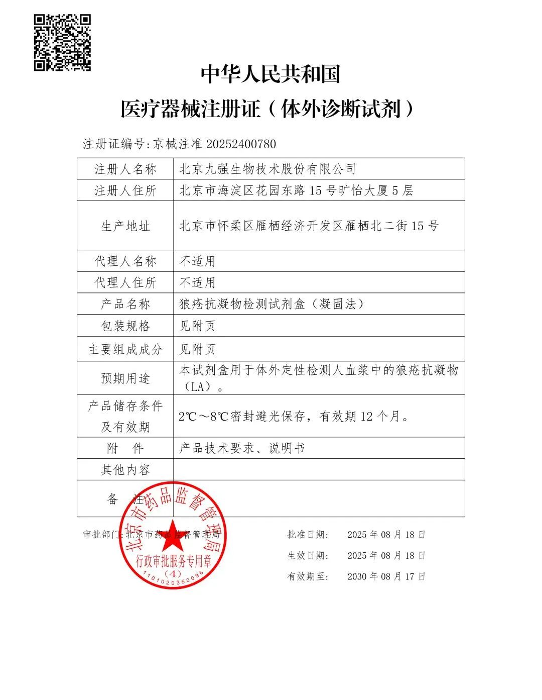 近日,开云online(中国)狼疮抗凝物检测试剂盒(凝固法)顺利取得国家药品监督管理局颁发的《医疗器械注册证》(注册证号:京械注准 20252400780)。