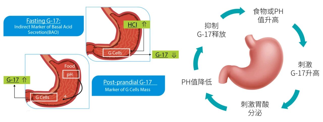 G-17与胃酸形成负反馈机制,胃窦功能正常时该机制可维持胃酸分泌的动态平衡;当胃窦萎缩时,该机制失衡。